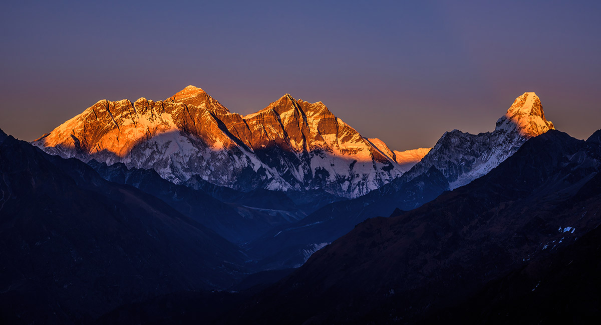 Tawoche, Cholatse, the Everest Group, Ama Dablam and Tamserku at sunset