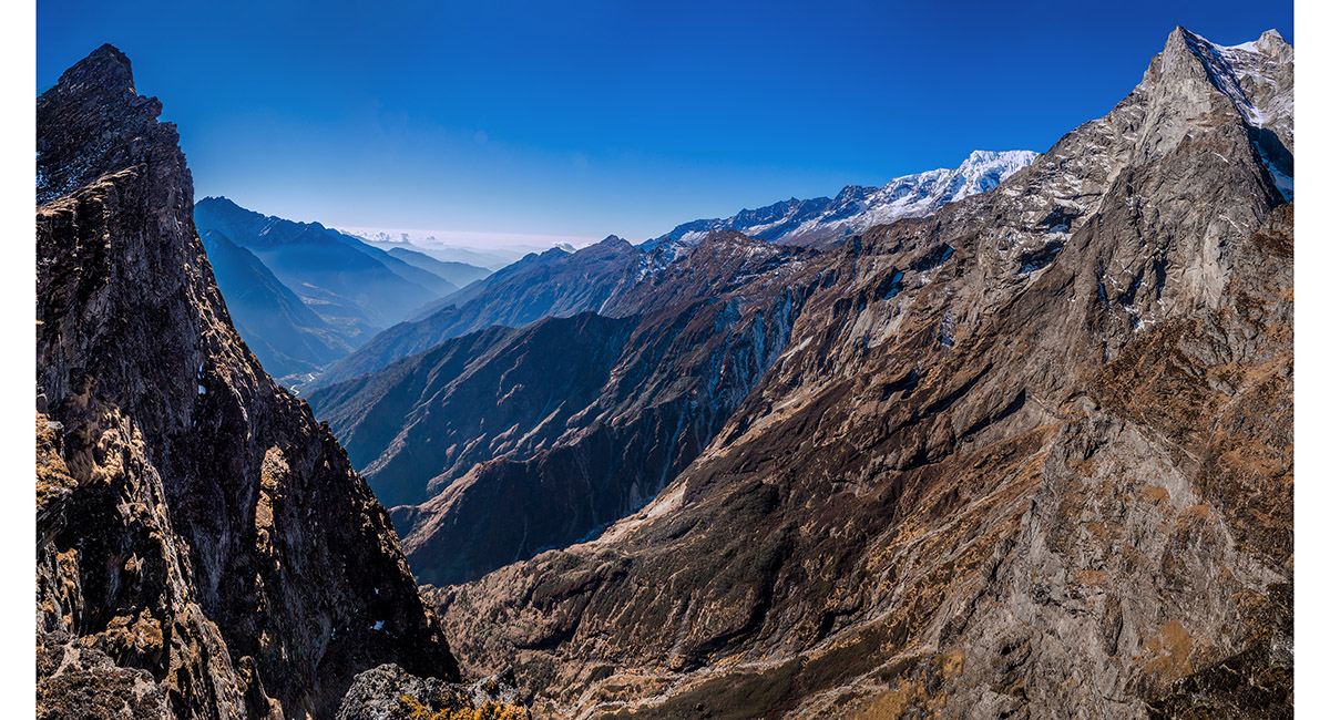 A view of the cliff off Kongde Peak, looking south to Lukla
