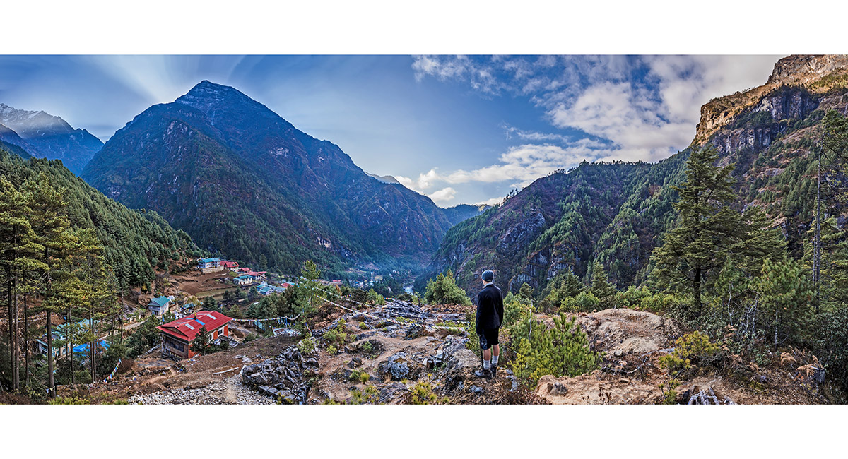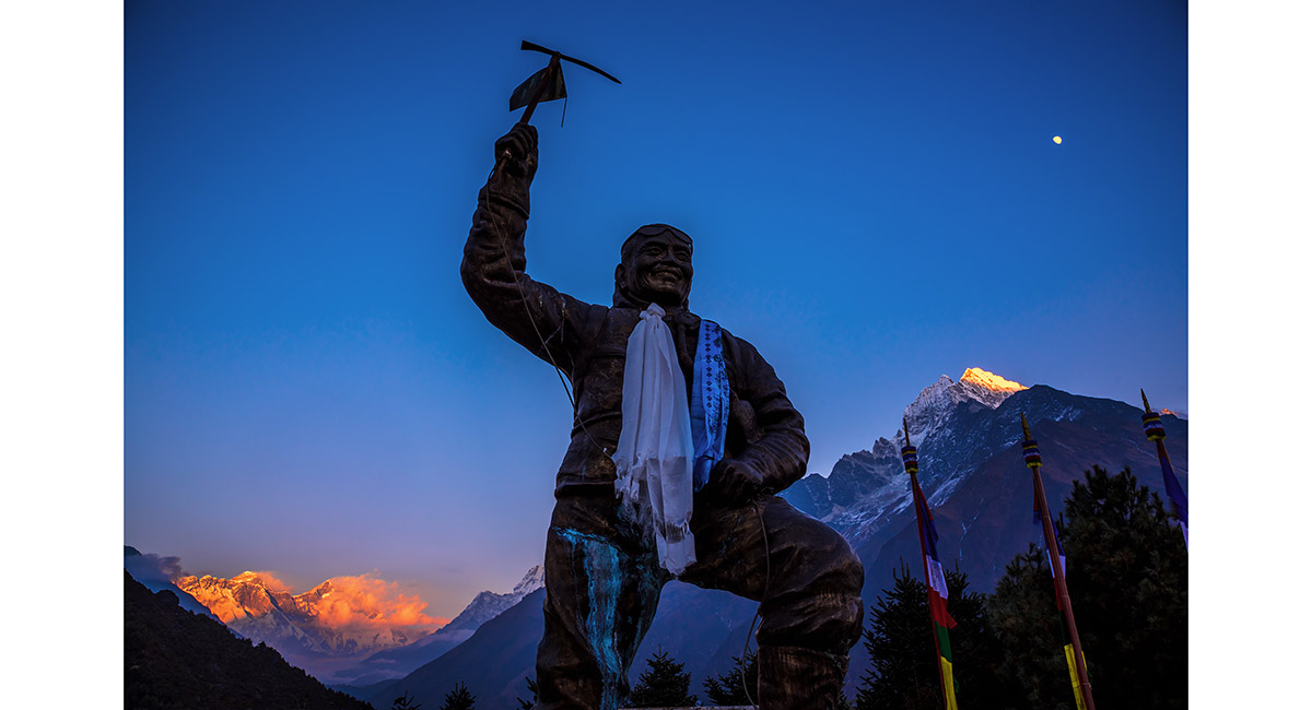 The memorial to Sherpa Tenzing Norgay, above Namche Bazaar. The Everest Group is lit by the morning sun behind