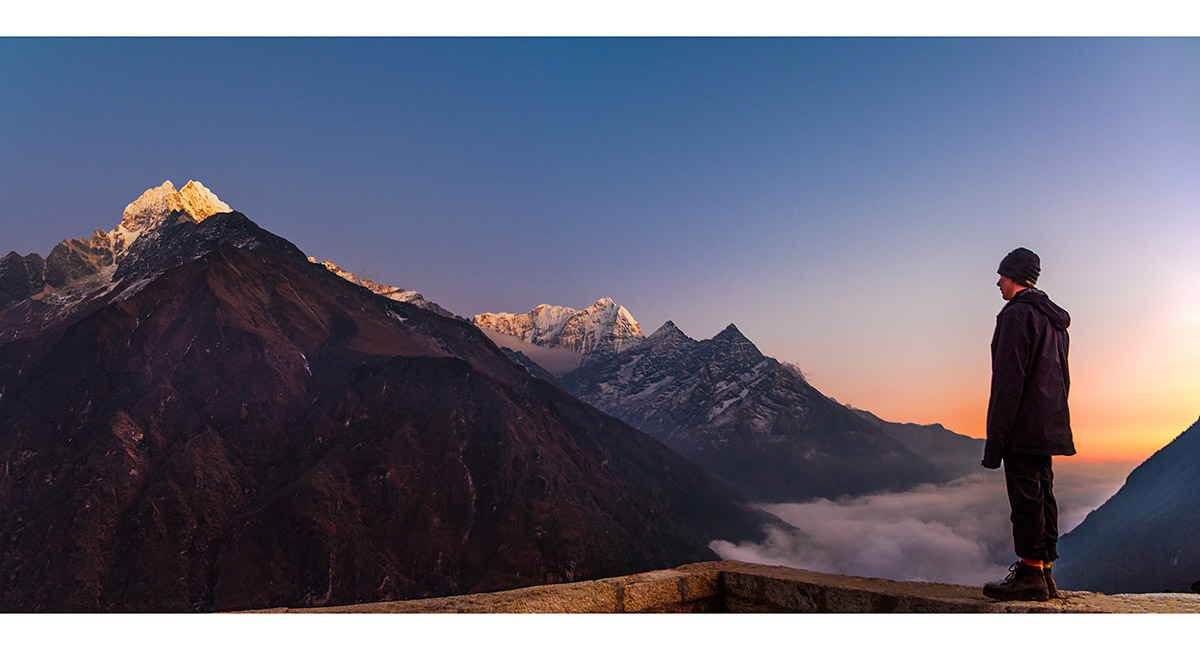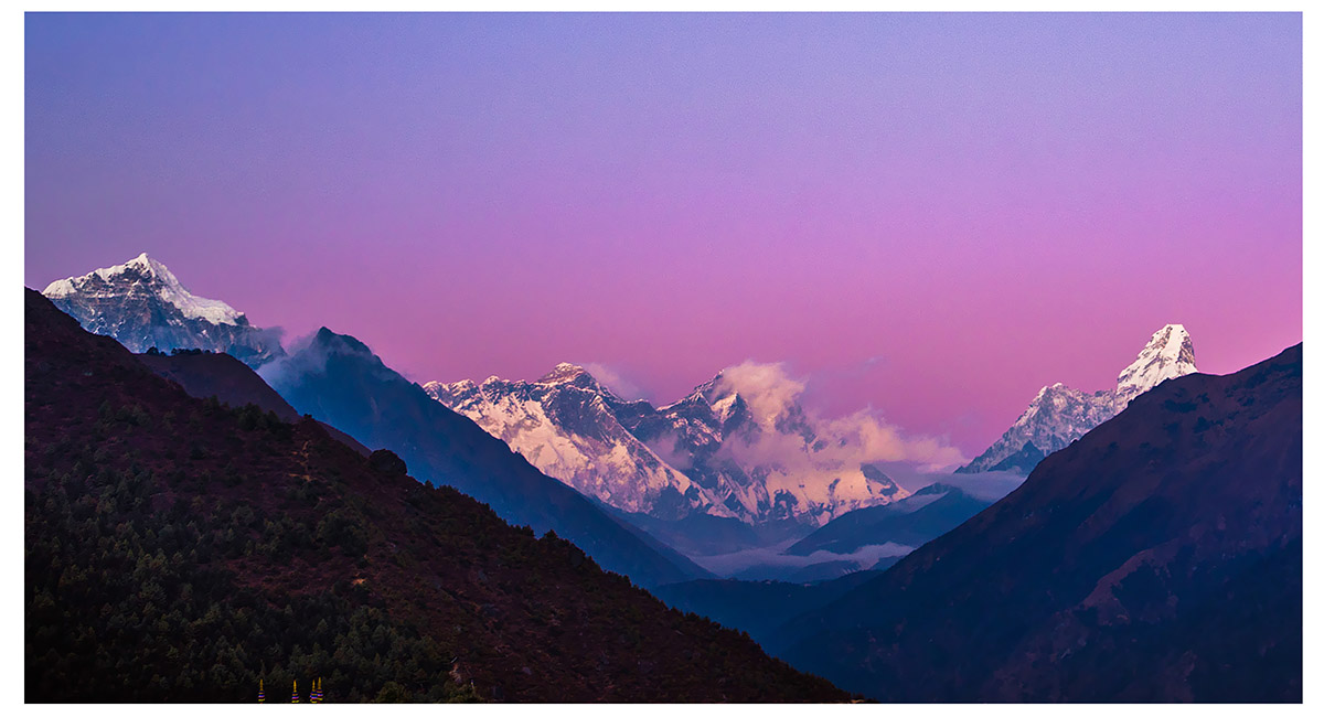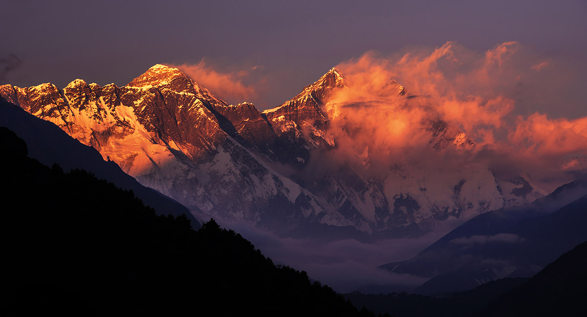 The Everest Group - Nuptse, Lhotse and Everest, burning red at dawn