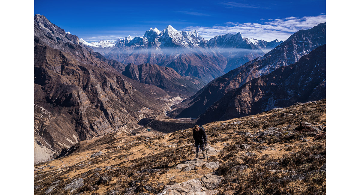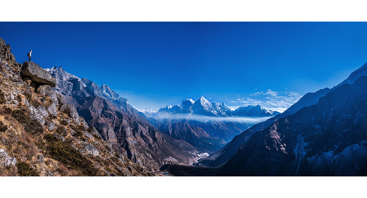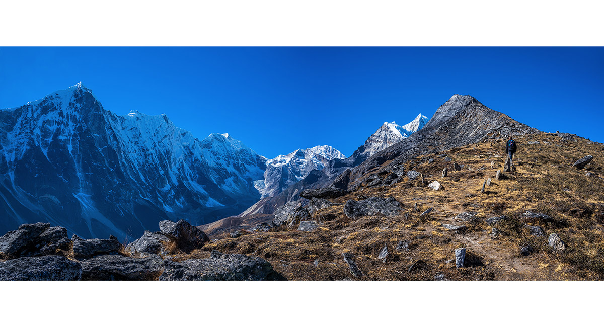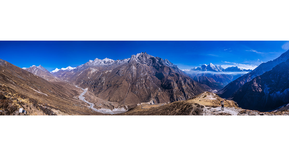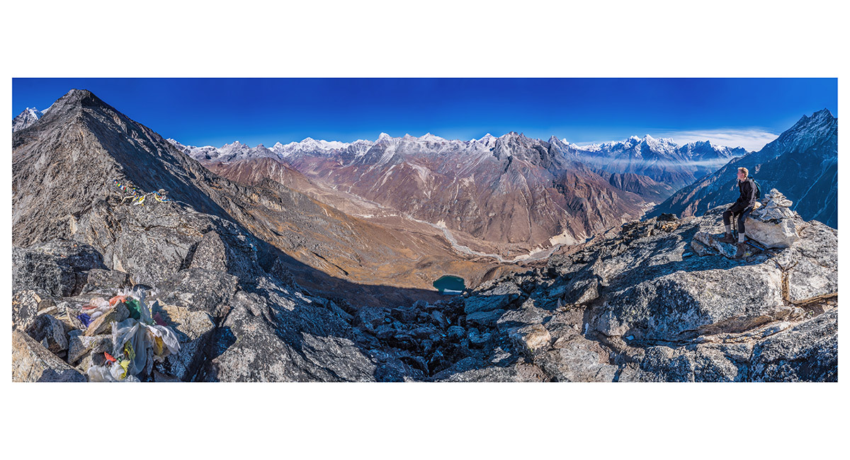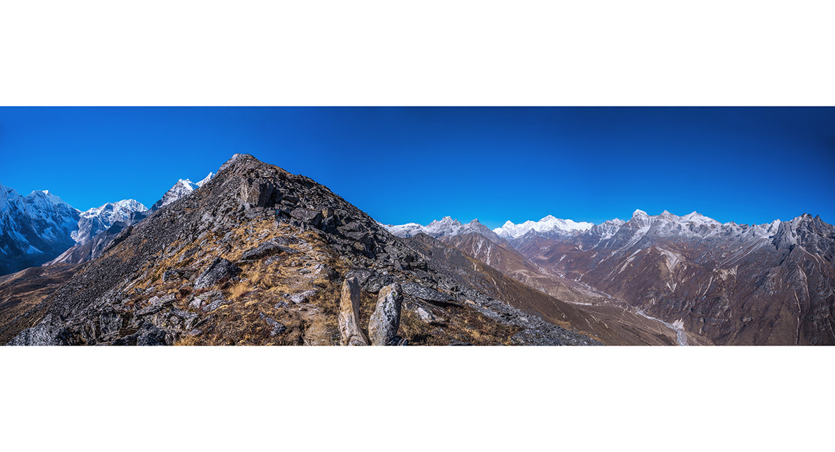 A panorama from the broad ridge leading to Sundur Peak. To the left is the Bhote valley leading to Renjo la and Nangpa La. The the right is the valley leading on to Namche Bazaar
