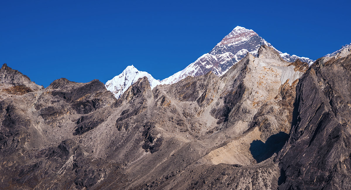 Looking to Sundur Peak (right) and the chain of peaks including, from left, Tengkangboche (6,490m), Panayo Tippa (6,696m), Bigphera-Go (6,730m) and Parcharmo (6,273m)