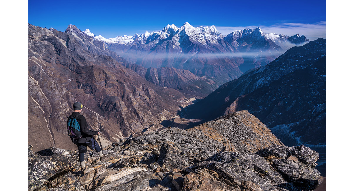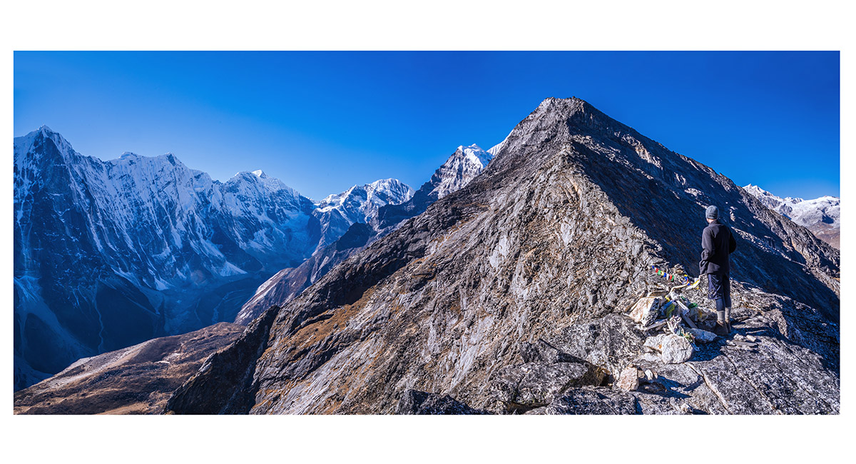 This view shows the rocky section leading between the trekking high point (5,000m) and the summit of Sundur Peak (5,377m). The mountains between span Cho Oyu on the left through Chomolungma, to Kusum Kanguru and Kwangde far right