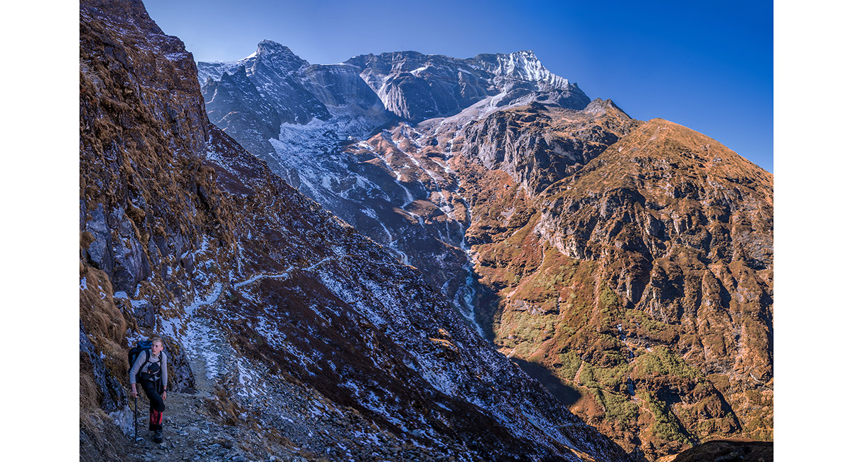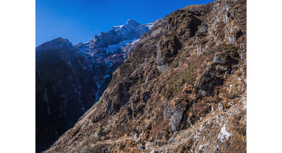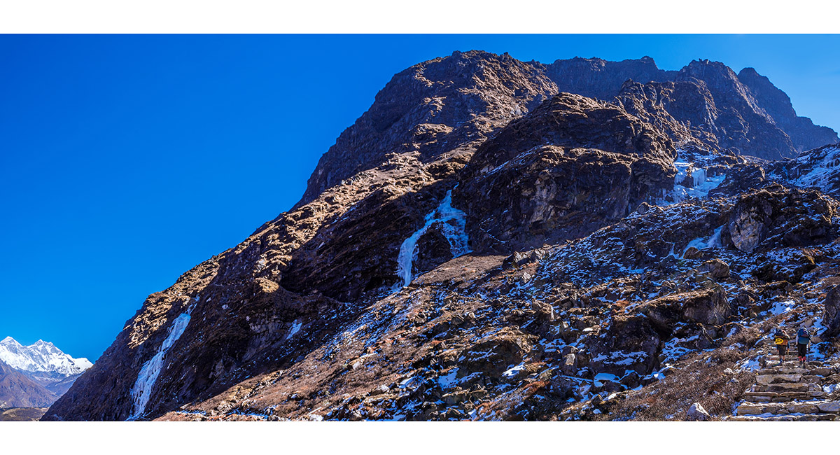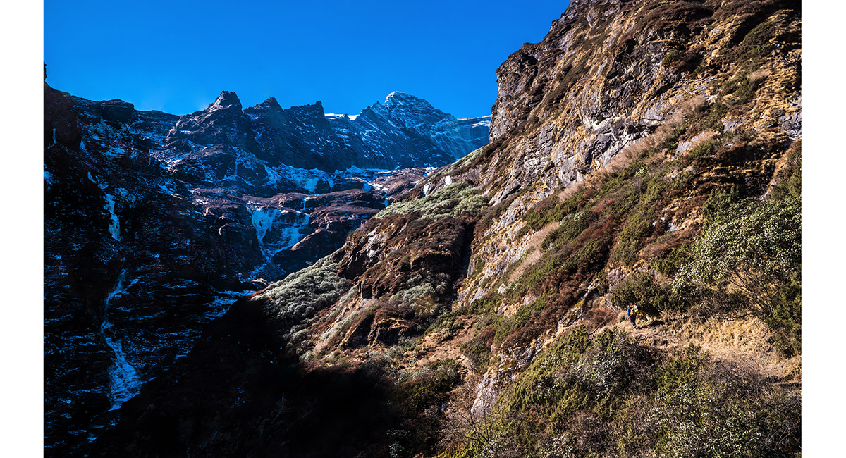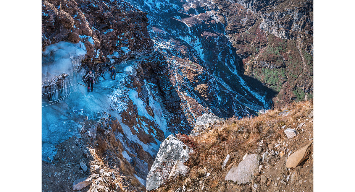 Approaching the steepest, coldest part of the route that skirts icy cliffs underneath Kwangde