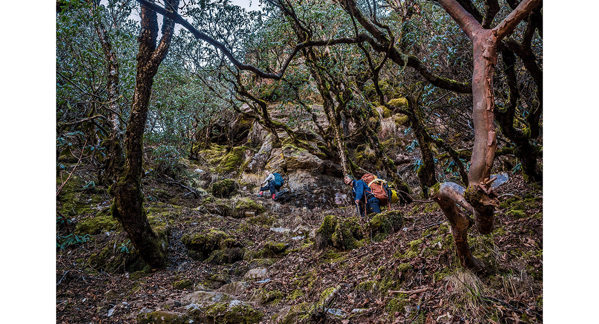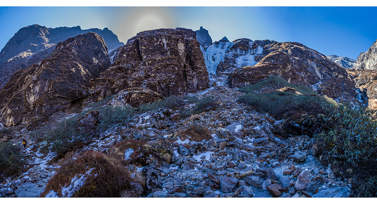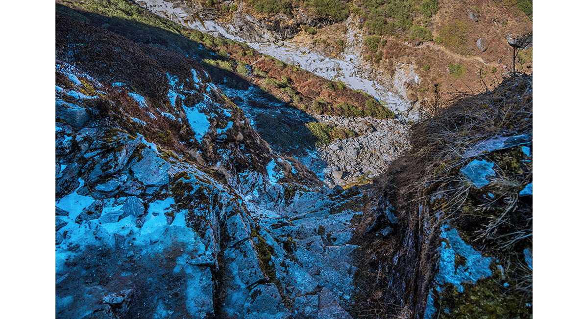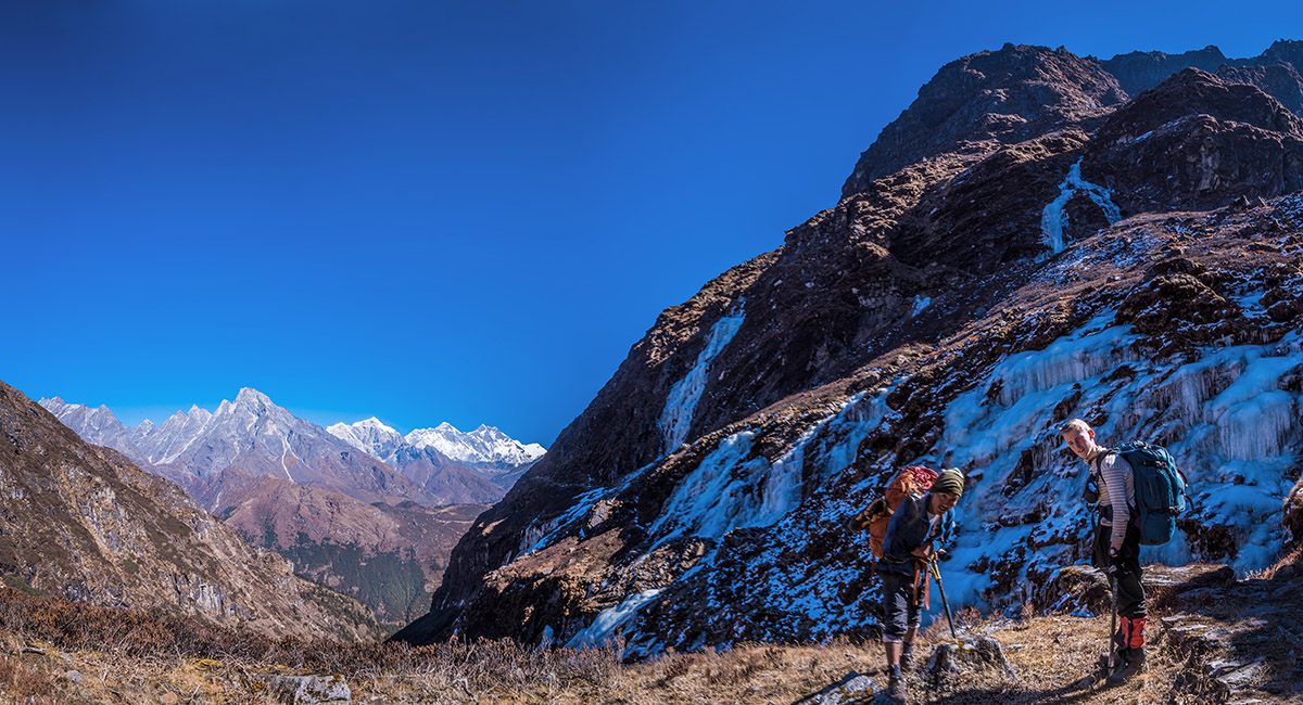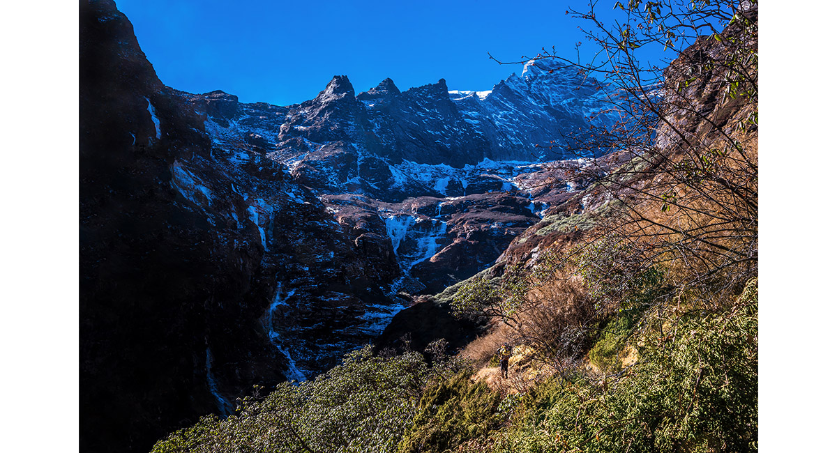 Approaching the steepest, coldest part of the route that skirts icy cliffs underneath Kwangde