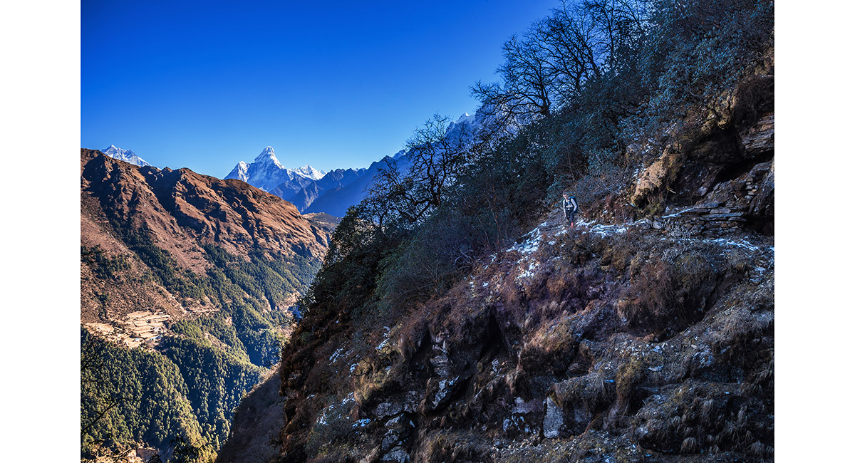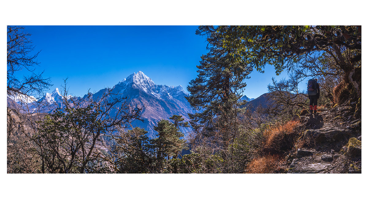 The trail leads through forest, with intermittent views across to Ama Dablam and then Namche Bazaar