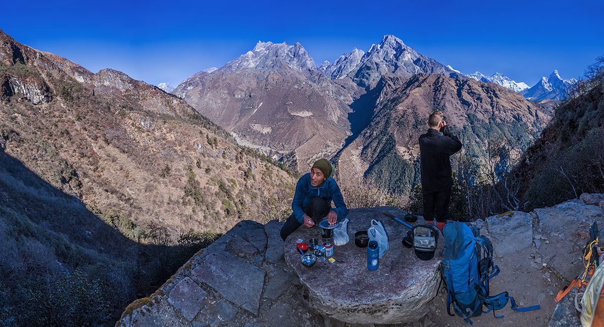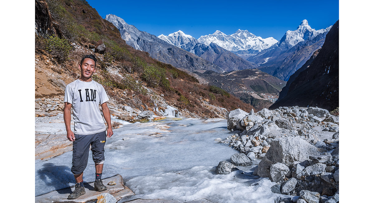 At a tea stop, with Khumila, the Everest Group and Ama Dablam on the sky line