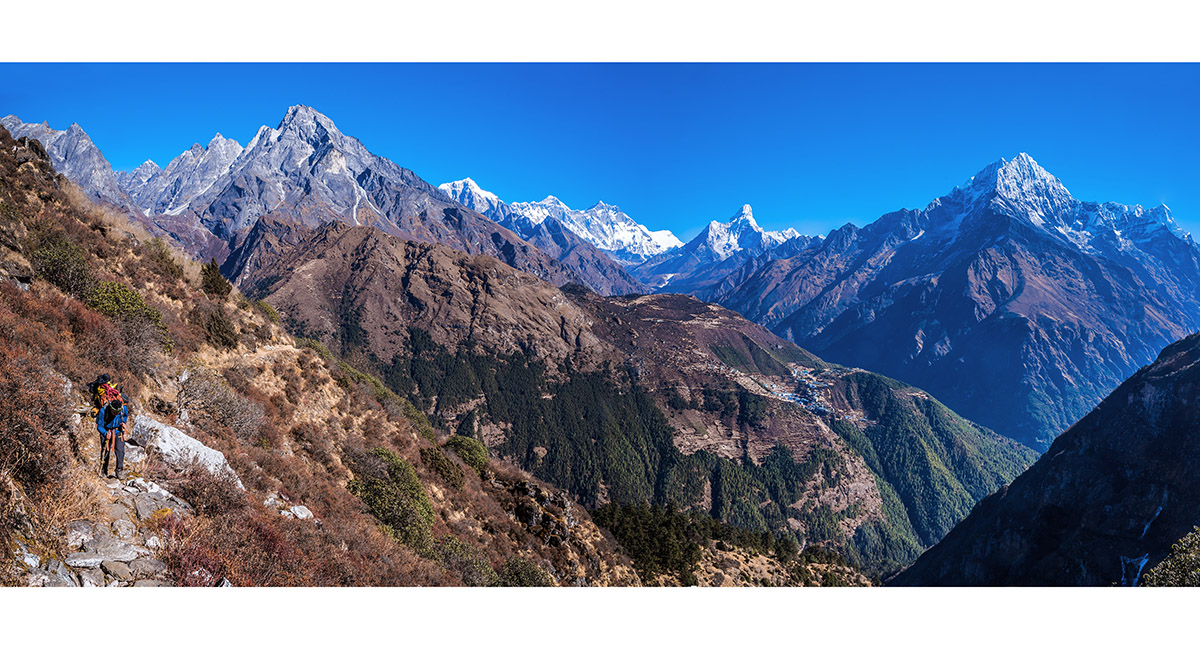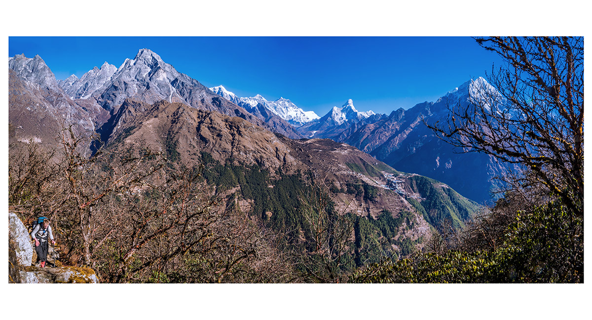 A wider and wider Khumbu aspect unfolds - now spanning Khumbila to Tamserku, with Namche Bazaar in the foreground
