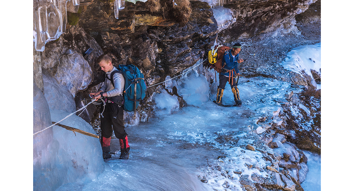 The trail crosses several frozen waterfalls, demanding extra care