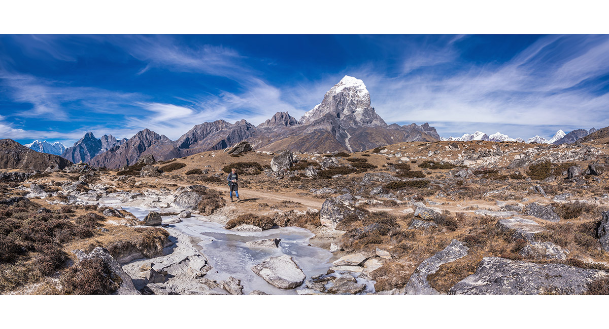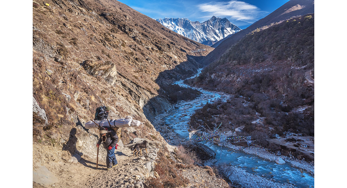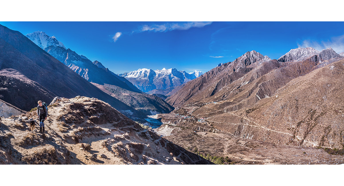 Descending to the Imja Khola from Pangboche, the Everest Group is behind