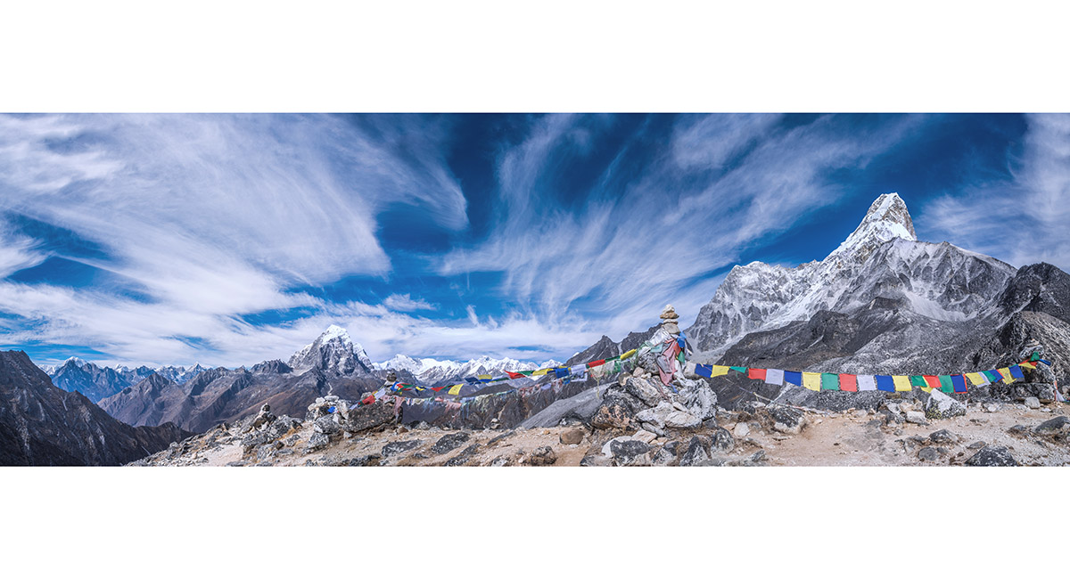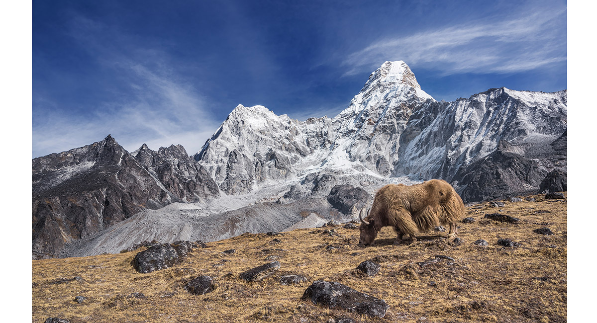 On the trail to Ama Dablam Base Camp, here at about 4,100m. The Kongde massif is distant centre