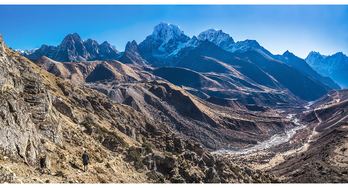 On the descent, with Cholatse and Taboche left of centre. The Everest Group is partly hidden at far left and Khumbi Yul Lha is distant far right