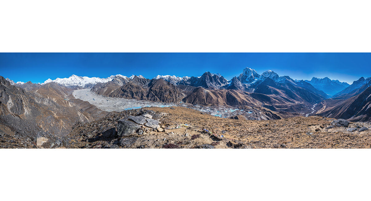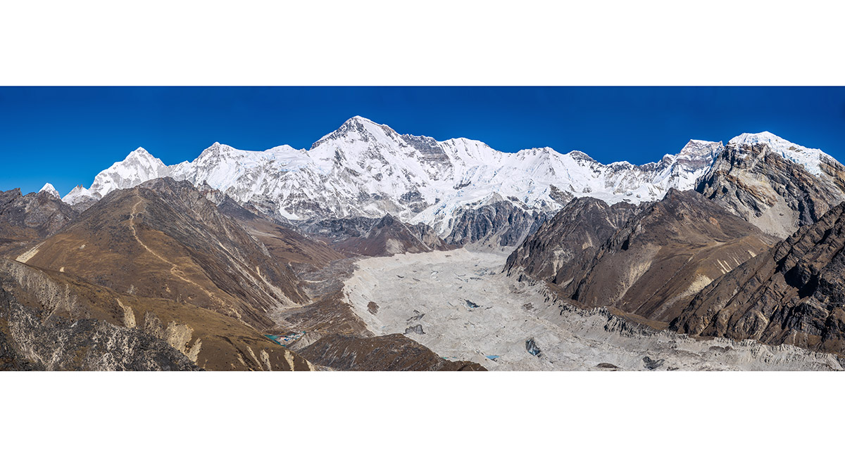 From left Phasang Lhamu Chuli (7,352m), Nangpai Gosum (7,321m), Cho Oyu (8,201m), Ngozumpa Kang I (7,905m), II (7,720m) and III (7,681m), Gyachung Kang (7,952m) and Kangchung (6,083m)