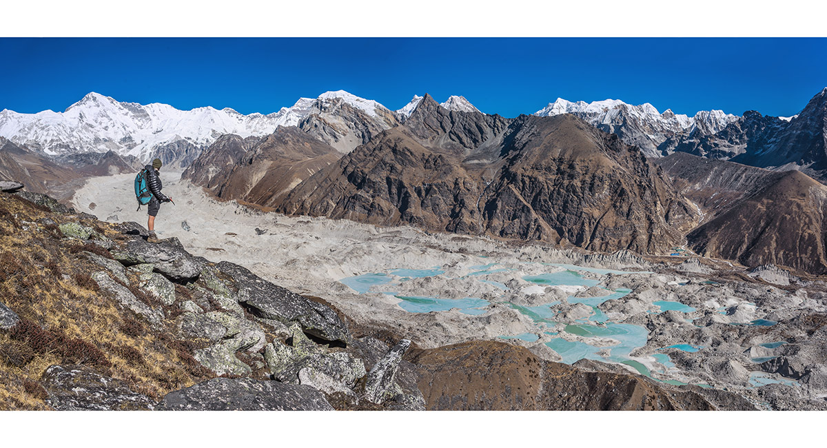 At the Everest Wifi transmitter, 5,000m. The Ngozumpa Glacier reaches south from Cho Oyu. Mt Everest is hidden behind the black rock peak right of centre. Kangtega, Thamserku and Kusum Kangguru are distant right