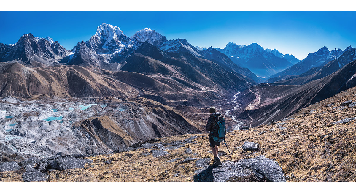 Big peaks ahead - from left Nangpai Gosum (7,321m), Chamar (7,282m), Cho Oyu (8,201m), Ngozumpa Kang I (7,905m) and II (7,720m), Kangchung (6,083m) and Gyachung Kang (7,952m)