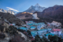 Pangboche at dawn, with Ama Dablam behind. Mt Everest is just visible top left. The trail to Ama Dablam Base Camp climbs right, towards the light in the centre