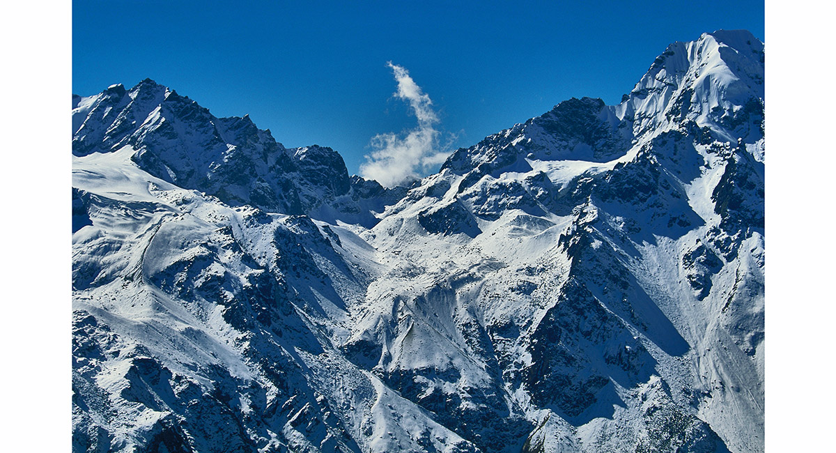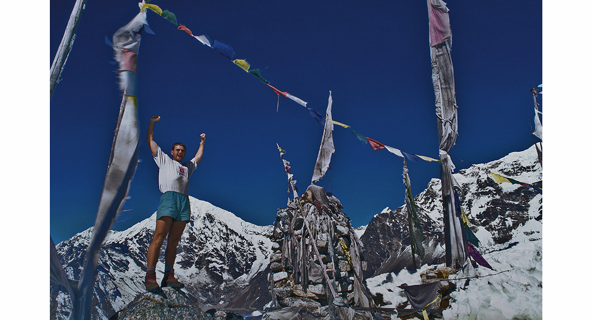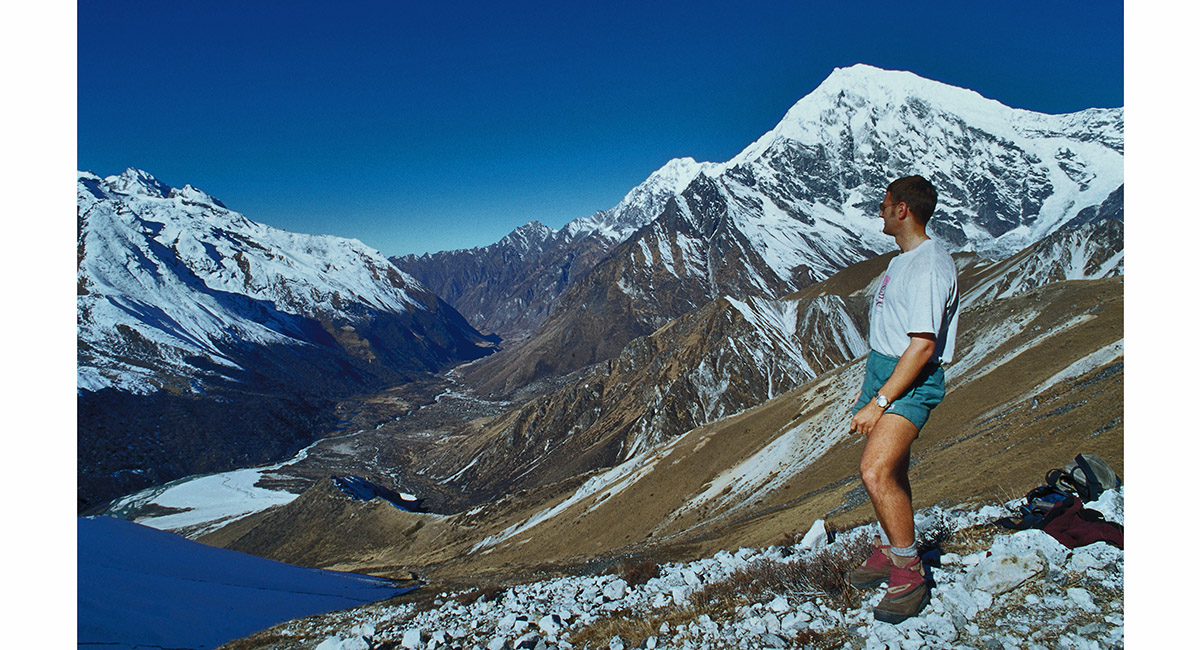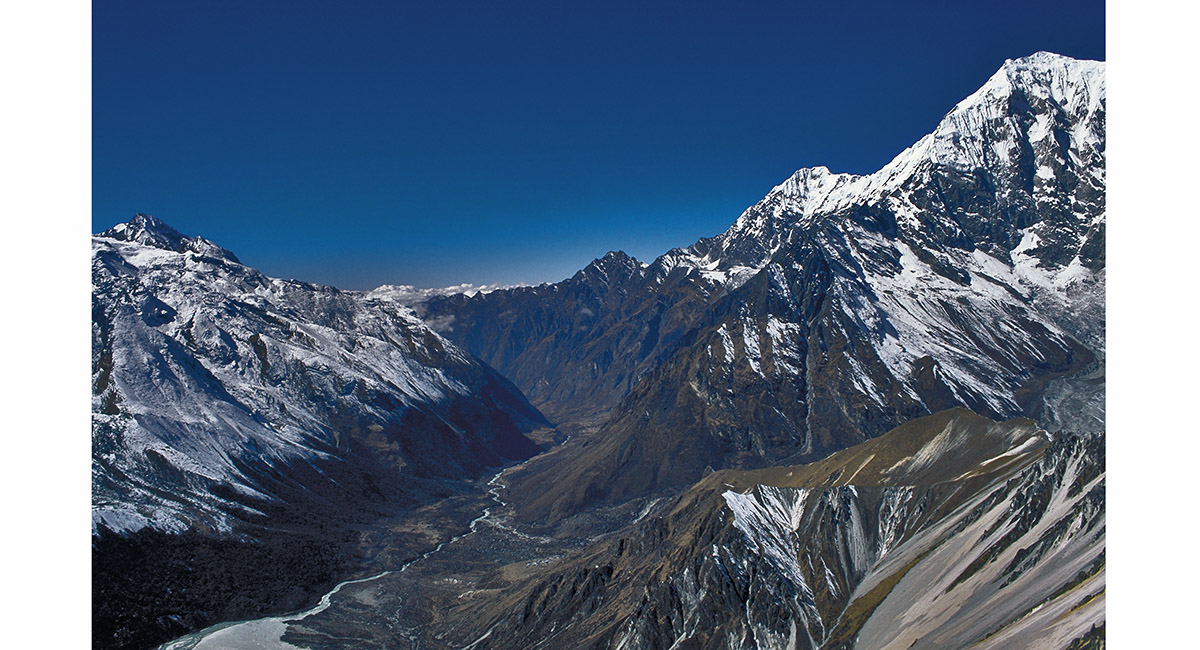 At Langtang Lirung’s feet, the Langtang valley stretches away to a southward bend, where it disappears from view