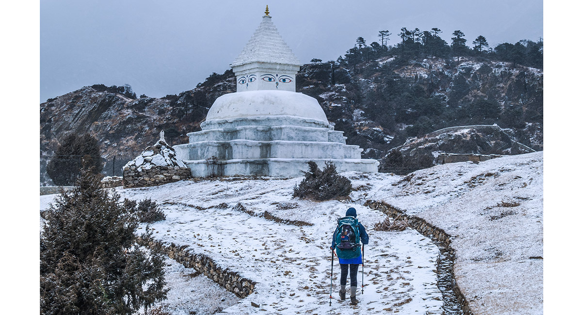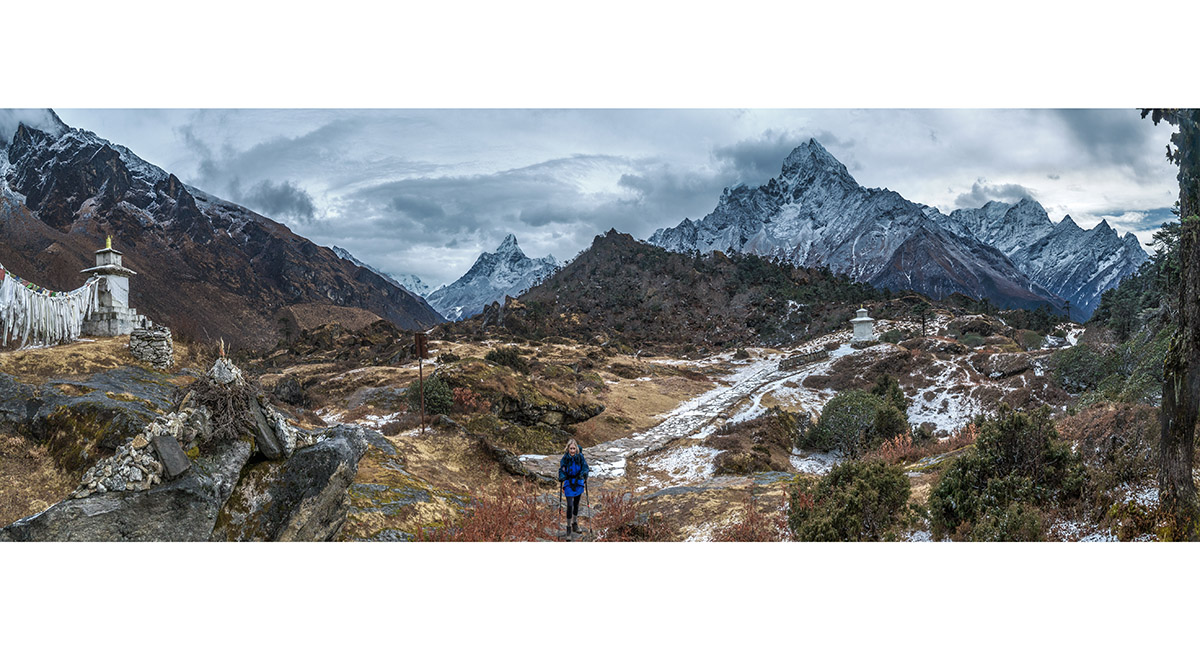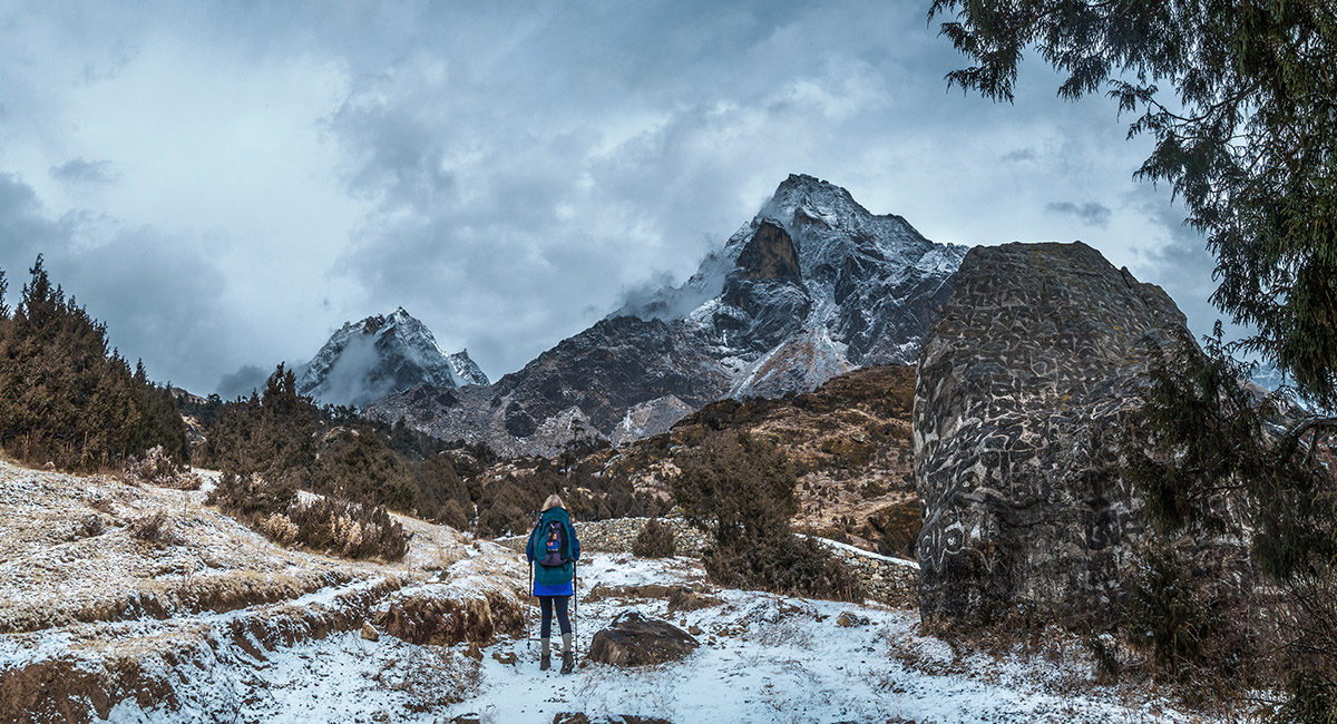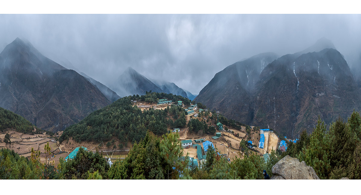 On the trail starting at the top of Namche Bazaar leading to Khumjung. A dusting of snow is about to fall