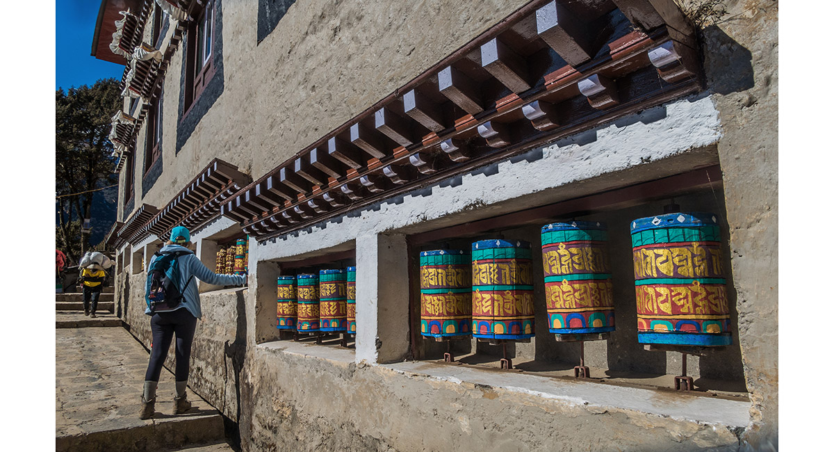 Prayer wheels lining the base of Namche Gompa