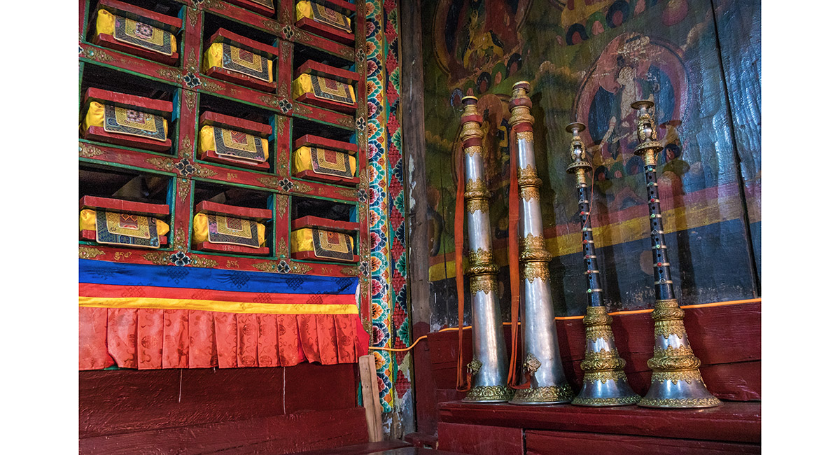 Horns and tablets inside Namche Gompa