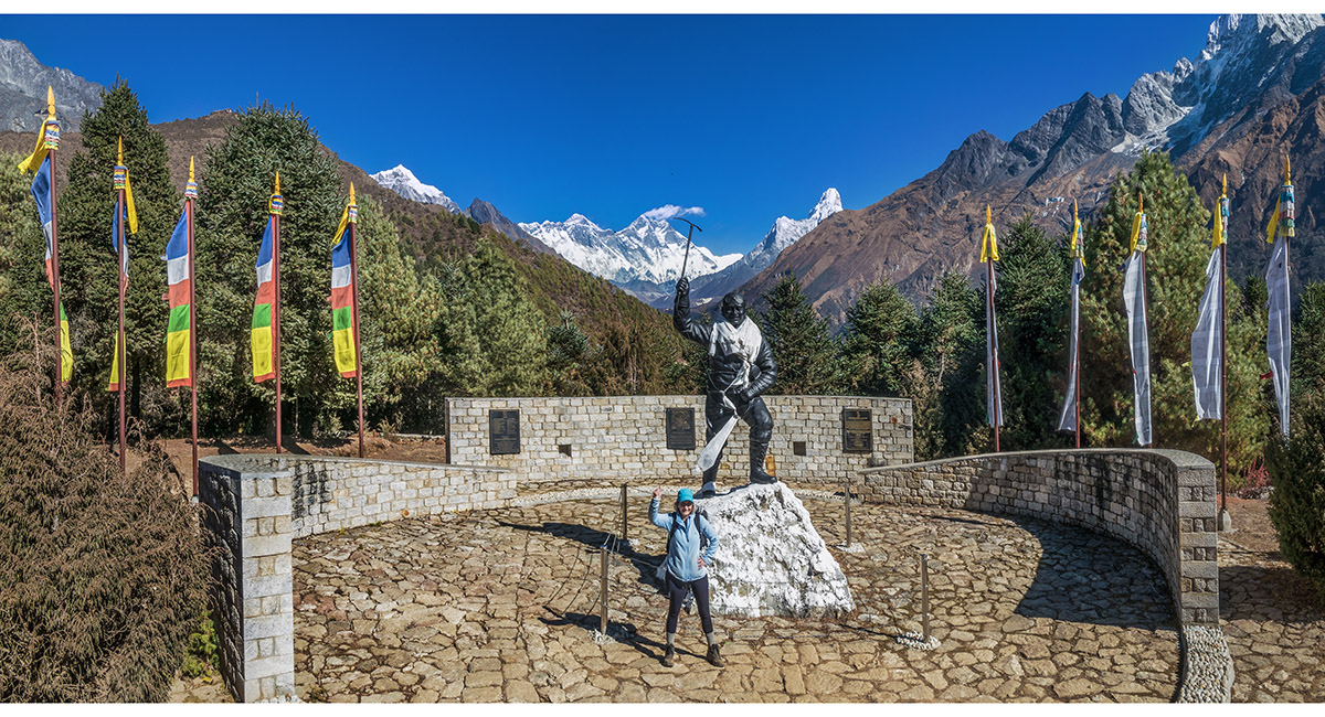 At the Tenzing memorial above Namche Bazaar, with Taboche, the Everest Group and Ama Dablam behind