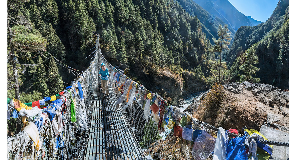 Cathy on the upper bridge giving access to Namche Hill, a rite of passage into Khumbu