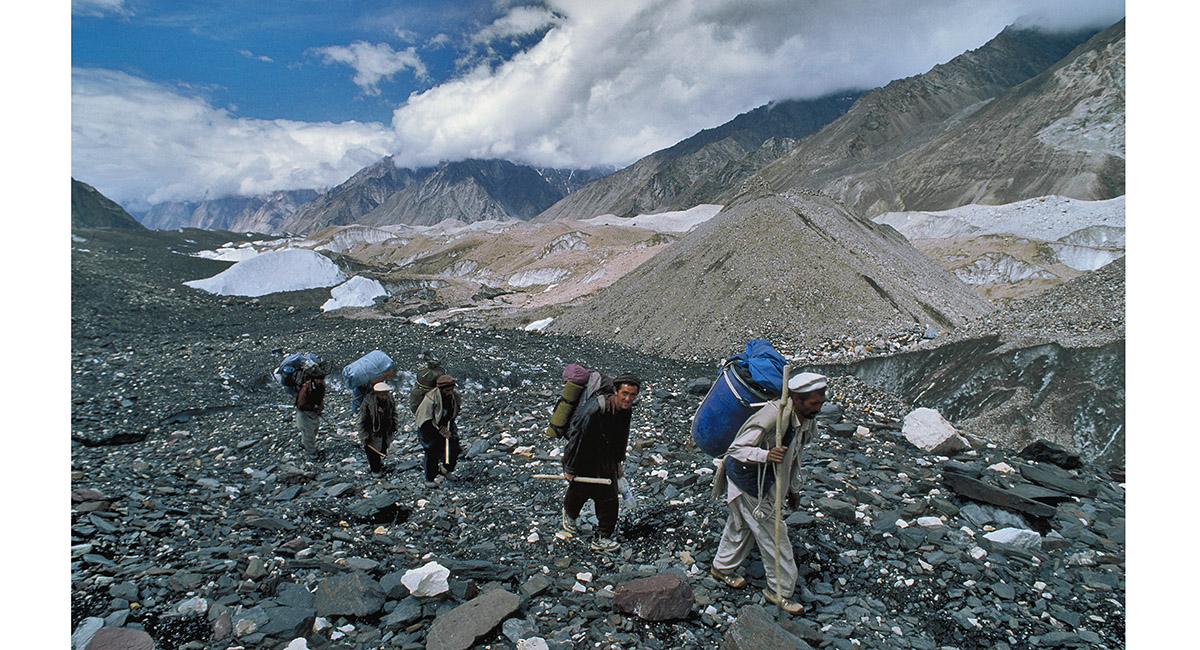 The porters stride out on the frozen surface of the Baltoro glacier above Khoburtse